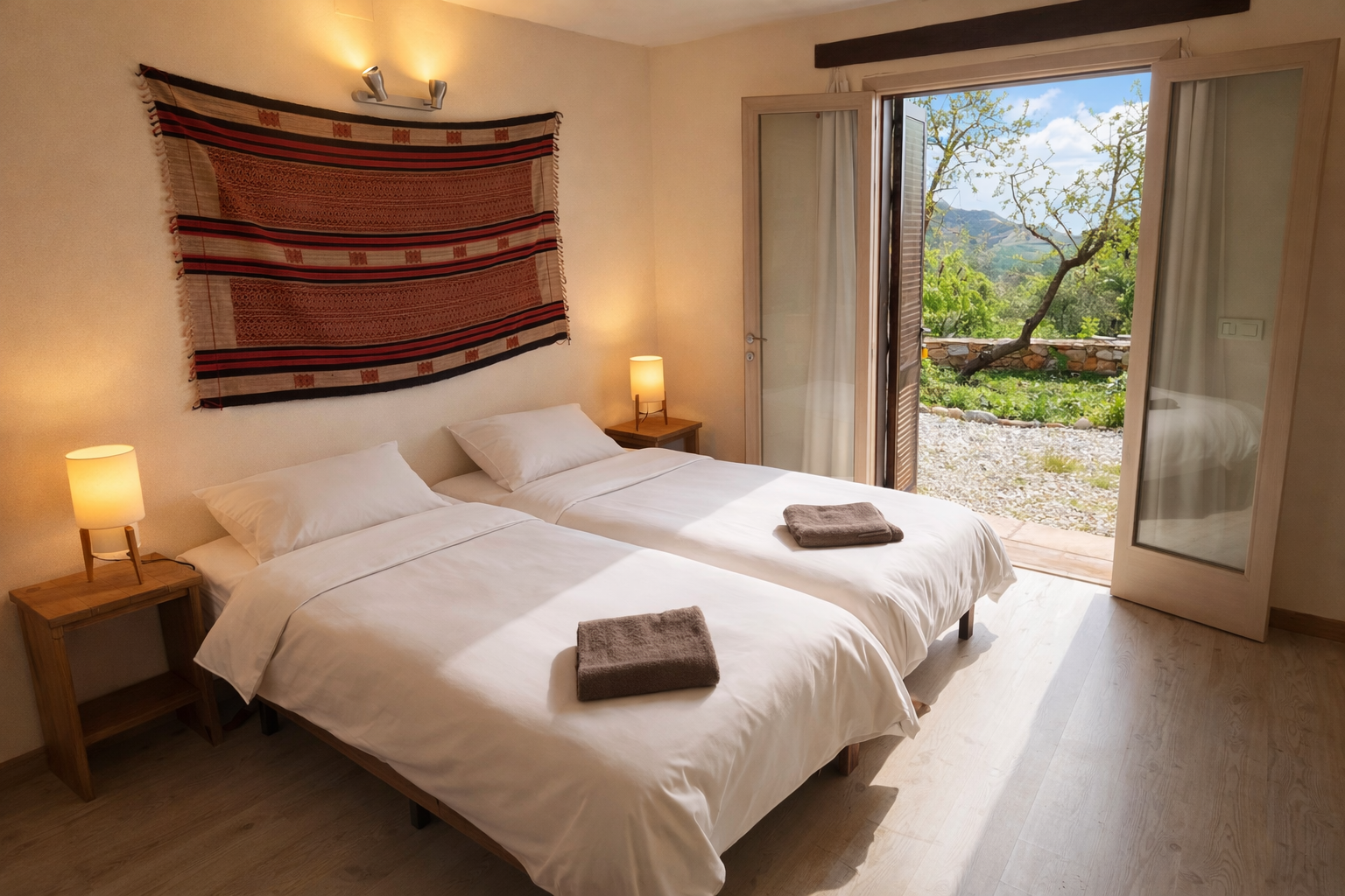 Set within the tranquil landscape, the retreat centre is nestled into the surrounding earth, which naturally regulates the temperature. Inside are seven bedrooms, simply furnished with a soft, peaceful aesthetic. Each room has private access to the gardens and uninterrupted views over the Mediterranean. There are six twin rooms and one larger room sleeping four, with a maximum capacity of sixteen guests. Inside the main cortijo, there is also an option for two additional double en-suite rooms.